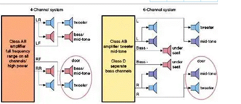 添加兩個(gè)通道可以解決幾個(gè)問題。首先,它允許大功率低音揚(yáng)聲器通過兩個(gè)新通道獨(dú)立驅(qū)動至汽車前排座椅下方的揚(yáng)聲器。消除門共振。更高的聲音保真度也是可能的,因?yàn)樗械膿P(yáng)聲器都沒有義務(wù)在整個(gè)頻率范圍內(nèi)工作。