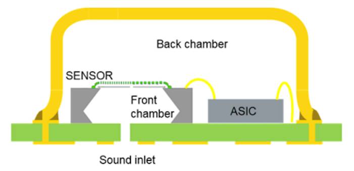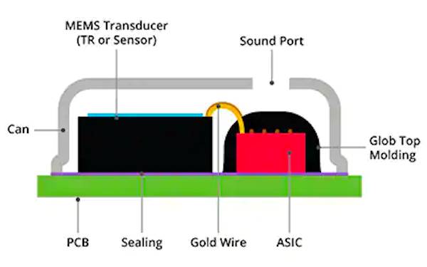 麥克風元件及其電路不在同一硅芯片上。他們的制造技術(shù)差異太大,無法將它們制造在一起。相反,麥克風和單獨的 ASIC(專用集成電路)組合在同一個封裝中,通過引線鍵合連接,如圖 5 所示。