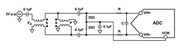 該 ADC 接口使用雙巴倫配置(如下所示)將單端輸入轉(zhuǎn)換為差分信號(hào)。