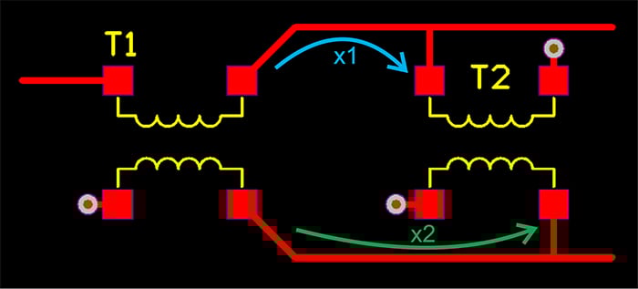 圖 5 顯示了該電路的另一種布局。在這種情況下,連接 T1 和 T2 的走線運(yùn)行到中點(diǎn)(上路徑為 n1,下路徑為 n2),然后連接到 T2 的相應(yīng)焊盤。這使得兩條路徑相同。此外,請注意對稱走線用于 T2 的兩個(gè)接地焊盤。