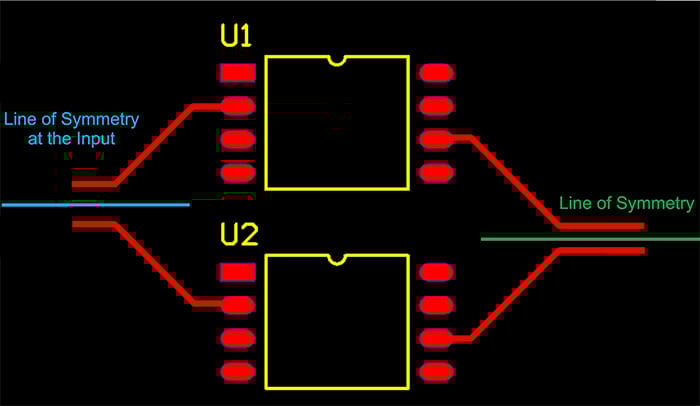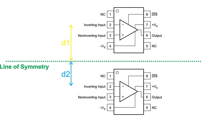 但是,非對稱包不是這種情況。例如,考慮一個(gè)采用 SOIC-8 封裝的運(yùn)算放大器。如圖 7 所示,相對于一條對稱線放置其中兩個(gè)封裝不會(huì)創(chuàng)建對稱布局。在此示例中,與下部運(yùn)算放大器的反相輸入相比,上部運(yùn)算放大器的反相輸入更遠(yuǎn)離對稱線。換句話說,d1 > d2。