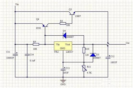4、也可以使用LM317線性可調(diào)三端穩(wěn)壓器實現(xiàn)。其輸出電流1.5A,若電流不夠時,可以使用三極管進行擴流,其原理如下圖所示。