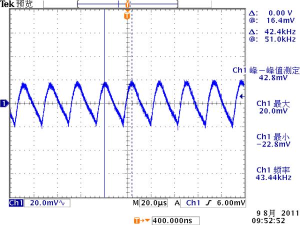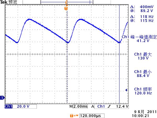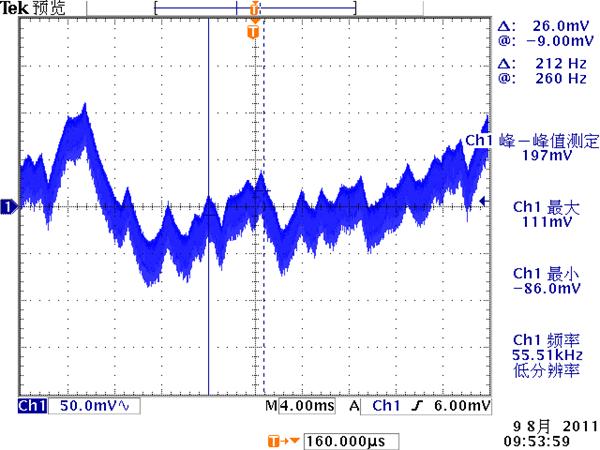 低頻紋波是與輸出電路的濾波電容容量相關(guān)。由于開關(guān)電源體積的限制,電解電容的容量不可能無限制地增加,導致輸出低頻紋波的殘留,該輸出紋波頻率隨整流電路方式的不同而不同。