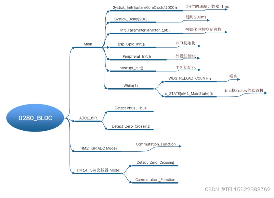 由圖可知,系統(tǒng)上電復(fù)位后,先執(zhí)行一段延時(shí)函數(shù),等待系統(tǒng)穩(wěn)定后開始初始化系統(tǒng)外設(shè) 及參數(shù),最后使能對應(yīng)的中斷,在 while 循環(huán)中執(zhí)行喂狗及 1ms 一次的慢速環(huán)狀態(tài)機(jī)。 1) ADC 法檢測過零點(diǎn)時(shí),在 ADC1 中斷執(zhí)行過零點(diǎn)檢測,在 TIM2 中執(zhí)行延時(shí)和換相。 2) 比較器法檢測過零點(diǎn)時(shí),在 TIM14 中斷執(zhí)行過零點(diǎn)檢測,并執(zhí)行延時(shí)和換相。
