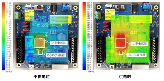 已確認到供電側(cè)的電源線(DC-DC轉(zhuǎn)換器及功率電感器)周邊的噪聲電平較高。