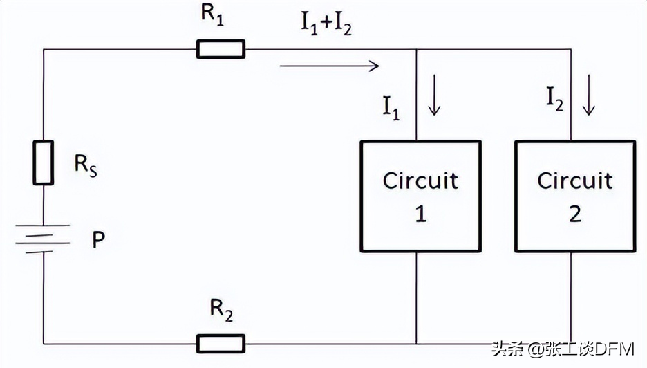 下圖顯示了通過共模阻抗進(jìn)行的噪聲去耦。電路1和電路2通過同一根導(dǎo)線獲得電源電壓的和接地環(huán)路。如果其中一個(gè)電路的電壓突然需要提高,另一個(gè)電路將降低,因?yàn)楣搽娫春蛢蓚(gè)回路之間的阻抗。