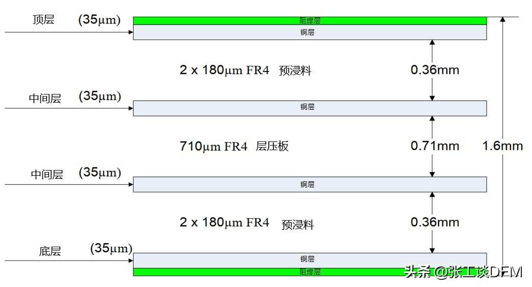 下圖顯示了圍繞核心(層壓板)構(gòu)建的 FR4 1.6 毫米 4 層 PCB 的疊層。核心是兩面都有銅層的厚介電片。核心的頂部和下方添加了薄的預(yù)浸料,即介電材料片。對于這種特定情況,中間層 1 和 2 分別代表接地層和電源層。頂層和底層用作信號平面,每側(cè)可以焊接多個(gè)組件。多層堆疊的配置在 EMC 應(yīng)用中起著至關(guān)重要的作用。