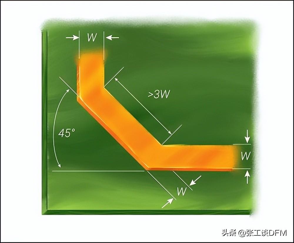 與過孔類似,不應(yīng)實(shí)施直角 90° 軌道轉(zhuǎn)彎,因?yàn)樗鼤黾蛹纳娙,?dǎo)致特性阻抗發(fā)生變化,從而導(dǎo)致反射。如圖 所示,所有正交走線都應(yīng)采用 45° 彎曲,以限制耦合到附近走線的噪聲。