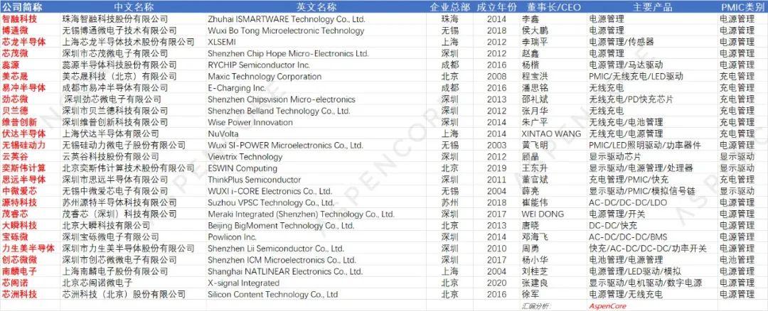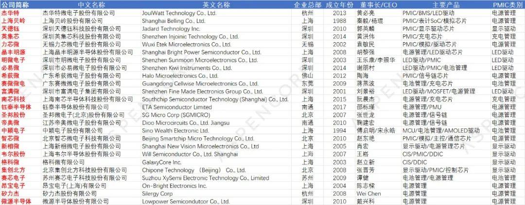 一、50家國產PMIC廠商基本信息匯總