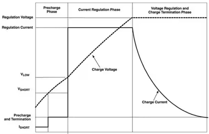 圖 3:鋰離子電池的充電分為三個(gè)不同的階段。首先,電池以適度的恒流預(yù)充,然后以較高的恒流快充,以快速增加能量。最后,當(dāng)電池輸出電壓達(dá)到充電電壓時(shí),充電曲線會(huì)轉(zhuǎn)換到恒壓充電,緩慢充滿電池電量。(圖片來(lái)源:Texas Instruments)