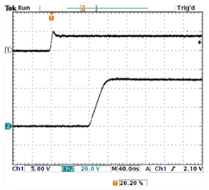 圖4.圖3所示的上升時間和導通傳播延遲,以40ns/cm掃描速率查看。