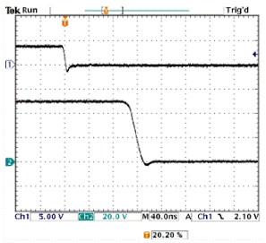 在圖3–5中,頂部波形是數(shù)字輸入,底部波形是在5.0Ω阻性負載上觀察到的25μs脈沖,通過開關(guān)連接到50V電源。由于波形是在短的極低電感薄膜電阻器上產(chǎn)生的電壓,因此它們非常接近開關(guān)電流波形。圖200的近似3A脈沖形狀在其過沖和上升時間(60ns至80ns)方面都受到高電流路徑中寄生電感和電容的影響。圖4顯示了該脈沖的上升時間和導通傳播延遲;圖5顯示了下降時間和關(guān)斷傳播延遲。圖6–8顯示了5Ω負載和10A脈沖的相同波形,采用相同的50V電源工作。由此產(chǎn)生的上升時間更接近MOSFET的30ns至40ns固有開關(guān)上升時間,受封裝和源極電感的限制。