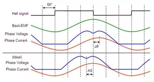 另一個設(shè)計挑戰(zhàn)是給定相位驅(qū)動電壓和產(chǎn)生的正弦波電流之間的相位延遲,通常發(fā)生于非補償型 BLDC 電機。電機可正常運行,但效能將降低,這會首先挫敗實現(xiàn)正弦控制方案的目標(biāo)。這種效能低下的原因不是驅(qū)動電壓和相位電流之間的相位延遲,而是相位電流和正弦反電動勢之間的相位延遲。