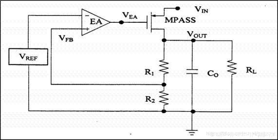 如今的LDO電路具有體積小,噪聲低,功耗低,價(jià)格低廉,使用方便等特點(diǎn),但其基本的結(jié)構(gòu)比較簡(jiǎn)單,包含了電壓基準(zhǔn)源(VREF),誤差放大器(EA),調(diào)整管(MPASS),反饋電阻(Rl,R2)四個(gè)模塊,如下圖所示。其中: