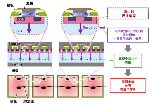 此外,由于浪涌電流降低了SiC周邊的阻抗,觸發(fā)其周圍元胞開(kāi)始導(dǎo)通,形成連鎖反應(yīng)。這種現(xiàn)象導(dǎo)致以沒(méi)有配置SBD的元胞為起點(diǎn),浪涌電流在整個(gè)芯片區(qū)域傳播。因此,浪涌電流分布在所有芯片的所有區(qū)域,防止了由于浪涌電流集中在特定芯片上而導(dǎo)致的芯片熱擊穿,從而提高了浪涌電流耐量(圖4)。