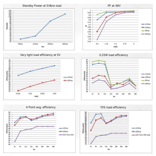 該方案在230Vac和5V輸出沒(méi)接負(fù)載的情況下,輸入功率小于100mW, 待機(jī)功耗及48V下PF曲線如下圖。在5V小負(fù)載下的效率及各個(gè)輸出下0.25W的效率也很好。在115 VAC(藍(lán)色曲線)和230 VAC (紅色曲線)輸入電壓的平均能效和輕載(10%負(fù)載)能效,從下面曲線圖可看到都遠(yuǎn)高于COC V5 Tier 2平均能效標(biāo)準(zhǔn)和COC V5 Tier 2輕載能效標(biāo)準(zhǔn),由于PFC在5V,9V,12V時(shí)停止工作,所以可以看到這幾個(gè)電壓下效率較高,28V和48V滿載下的效率也非常高。