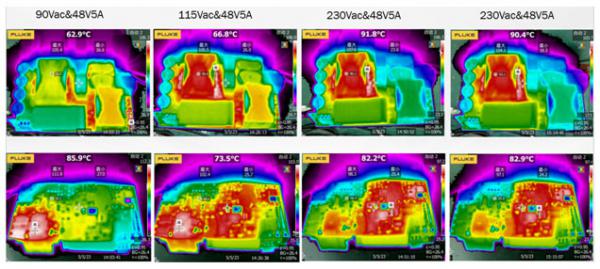由于非常高的效率,該方案在沒(méi)有加任何導(dǎo)熱材料及主動(dòng)散熱的情況下,靠自然散熱得到下列的熱成像圖,該熱成像圖是在滿載工作30分鐘后測(cè)得。