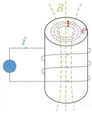 對(duì)一根流過(guò)電流為I的導(dǎo)線,在導(dǎo)線的垂直平面形成交變磁場(chǎng),交變磁場(chǎng)在導(dǎo)體內(nèi)部產(chǎn)生感應(yīng)電動(dòng)勢(shì),感應(yīng)電動(dòng)勢(shì)在導(dǎo)體內(nèi)部形成渦流電流,渦流在導(dǎo)體內(nèi)部與電流的變化趨勢(shì)相反,阻礙電流的變化,渦流的變化在導(dǎo)體表面與電流的變化趨勢(shì)相同。