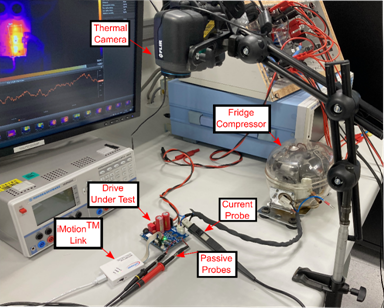 為了研究和分析驅(qū)動(dòng)器在測(cè)試條件下的性能,選擇了一個(gè)典型的冰箱壓縮機(jī)。圖8所示為將冰箱壓縮機(jī)用作負(fù)載的實(shí)驗(yàn)室試驗(yàn)臺(tái)。使用熱像儀來(lái)監(jiān)測(cè)逆變器的頂部殼溫?刂品桨笇(shí)現(xiàn)采用了英飛凌的iMOTIONTM IMC101T-T038單片機(jī)和隔離式調(diào)試探頭iMOTIONTM Link。被測(cè)驅(qū)動(dòng)器直接向DC link供電,以避免任何電網(wǎng)電壓波動(dòng)或負(fù)載對(duì)電壓造成影響,并且支持使用標(biāo)準(zhǔn)無(wú)源探頭,而不需要浮地的測(cè)量設(shè)備。將無(wú)源探測(cè)器連接至低邊功率器件,以測(cè)量器件的典型dv/dt行為。最后,在輸出相中連接一個(gè)電流探頭,用于監(jiān)測(cè)電機(jī)電流。