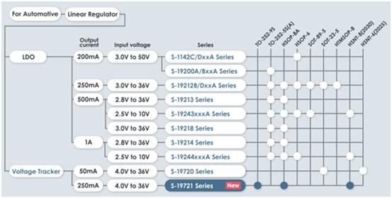 新產(chǎn)品S-19721系列具備業(yè)界最低等級(※1)失調(diào)電壓,在為ECU外部的傳感器和元器件供電時(shí),可以實(shí)現(xiàn)準(zhǔn)確的傳感器讀數(shù)。其次,由于S-19721系列可以輸出最大250mA的電流,還可用于、因傳感器的高功能化而需要大電流輸出的應(yīng)用、以及隨著傳感器安裝數(shù)量的增加,需向多個(gè)傳感器一起供電的應(yīng)用。