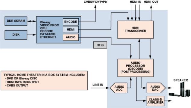 HTiB 屬于完整的視頻播放系統(tǒng),一般采用多通道音頻放大器 和環(huán)繞聲音響系統(tǒng)來播放音頻。此外, 該系統(tǒng)通常還包括一個 DVD 或 Blu-ray™視頻播放機。HTiB 簡化了視頻播放機、放大 器和揚聲器的安裝和功率匹配, 它主要處理音頻, 視頻則通過 HDMI 接口傳送給電視機。圖 2 所示為一個典型的 HTiB 系統(tǒng)。