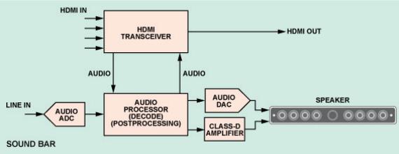 隨著超薄大屏幕平板電視的日益普及,新興的 SOUNDBAR 音 箱成為一種補充性的影音系統(tǒng)。這種音響系統(tǒng)結(jié)構(gòu)緊湊、安裝 方便, 音質(zhì)遠(yuǎn)遠(yuǎn)高于電視揚聲器。大部分 HTiB 和 SOUNDBAR 音箱都與大屏幕 HDTV 配套使用, 因此其音頻和視頻連接主要采用 HDMI 接口。 SOUNDBAR 音箱一般都擁有多個 HDMI輸入端用于各種信號源,擁有一個 HDMI 輸出端用于連接電視,同時內(nèi)置音頻處理系統(tǒng)和揚聲器。圖 3 所示為典型的 SOUNDBAR 音箱系統(tǒng)。
