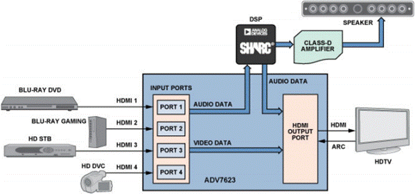 圖 4. 采用 ADV7623 HDMI 收發(fā)器的 HTiB 系統(tǒng)
