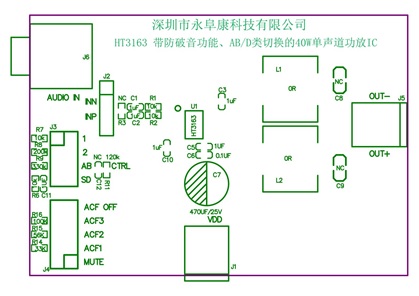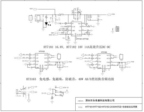 2,采用帶AB/D類切換功能的單聲道40W功放芯片HT3163(立體聲應(yīng)用采用2顆),能夠完全避免FA/AM收音干擾。兩節(jié)鋰電供電升壓到16V輸出2*30W;3節(jié)鋰電或鉛酸電池升壓18V輸出2*40W;