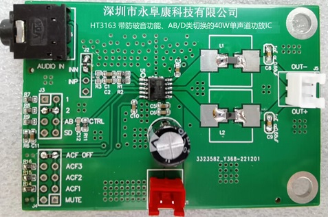 深圳市永阜康科技有限公司針對帶收音功能的戶外藍牙音箱、車載音頻系統(tǒng)的應(yīng)用痛點,推廣一款無需散熱器貼片ESOP-10簡易封裝、內(nèi)置防破音AB類/D類切換單聲道40W音頻功放IC-HT3163。在D類模式,18V供電、THD+N=10%條件下,能夠持續(xù)提供40W/4Ω功率輸出。在AB類模式,12V供電、THD+N=10%條件下,能夠持續(xù)輸出17W/4Ω功率。能通過一個主控IO口實現(xiàn)關(guān)斷、開啟、D類/AB類、防破音開啟/關(guān)閉等各種模式的切換,節(jié)省藍牙主控的資源;其3V-18V寬泛的工作電壓,滿足1-3節(jié)鋰電池、12V鉛酸電池的應(yīng)用;根據(jù)不同喇叭腔體三種防破音可選,滿足不同消費群體的音質(zhì)需求;擴頻工作模式方便EMI認證測試;輸出無濾波節(jié)省外圍成本;采用ESOP-10貼片封裝,外圍元器件少,應(yīng)用加工簡單。