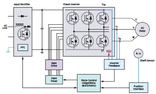 在過(guò)去的幾十年里,從傳統(tǒng)的并網(wǎng)電機(jī)向逆變器驅(qū)動(dòng)電機(jī)的過(guò)渡一直在穩(wěn)步、持續(xù)地進(jìn)行。這是工業(yè)旋轉(zhuǎn)設(shè)備的重大轉(zhuǎn)型,通過(guò)提高電機(jī)和終端設(shè)備的使用效率,不僅實(shí)現(xiàn)了工藝改進(jìn),還能節(jié)省大量能源。變速驅(qū)動(dòng)器和伺服驅(qū)動(dòng)系統(tǒng)提高了電機(jī)控制性能,從而可以改善要求嚴(yán)苛應(yīng)用的質(zhì)量和同步功能。如圖1所示,功率級(jí)使用了功率逆變器、高性能位置檢測(cè)以及電流/電壓閉環(huán)反饋,因此電機(jī)性能和效率得以提高。