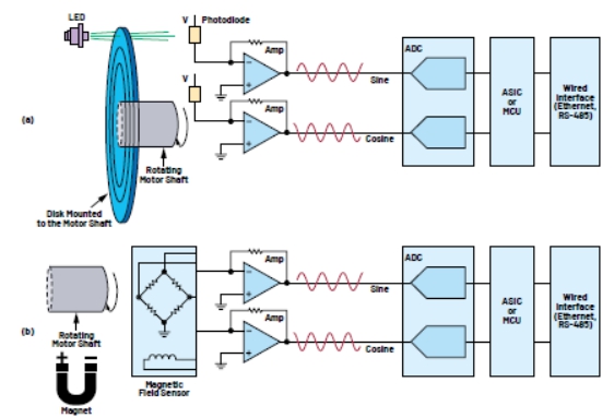 編碼器通過(guò)跟蹤旋轉(zhuǎn)軸的速度和位置來(lái)提供閉環(huán)反饋信號(hào)。光學(xué)和磁編碼器技術(shù)使用非常廣泛,如圖2所示。在通用伺服驅(qū)動(dòng)器中,編碼器用于測(cè)量軸位置,從中可推導(dǎo)出驅(qū)動(dòng)器轉(zhuǎn)速。機(jī)器人和離散控制系統(tǒng)需要準(zhǔn)確且可重復(fù)的軸位置。光學(xué)編碼器由帶有精細(xì)光刻槽的玻璃圓盤(pán)組成。當(dāng)光穿過(guò)圓盤(pán)或從圓盤(pán)反射時(shí),光電二極管傳感器檢測(cè)光的變化。光電二極管的模擬輸出經(jīng)過(guò)放大和數(shù)字化處理后,通過(guò)有線(xiàn)電纜發(fā)送到逆變器控制器。磁編碼器由安裝在電機(jī)軸上的磁體和磁場(chǎng)傳感器組成,傳感器提供正弦和余弦模擬輸出,輸出經(jīng)過(guò)放大和數(shù)字化處理。光學(xué)和磁傳感器信號(hào)鏈類(lèi)似,如圖2所示。