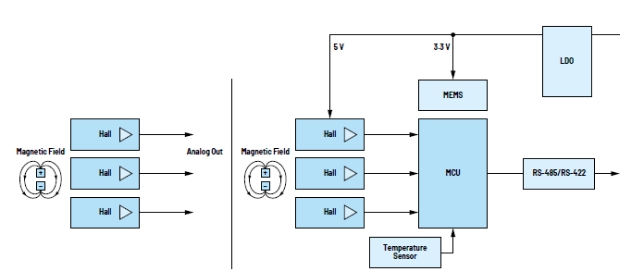 AMR傳感器對(duì)磁場(chǎng)方向變化很敏感,而霍爾技術(shù)對(duì)磁場(chǎng)強(qiáng)度很敏感。所以傳感器對(duì)系統(tǒng)中的氣隙和機(jī)械公差變化具有很強(qiáng)的容忍度,這一點(diǎn)很有優(yōu)勢(shì)。此外,AMR傳感器的工作磁場(chǎng)沒(méi)有上限,因此,這種傳感器在高磁場(chǎng)下工作時(shí)幾乎不受雜散磁場(chǎng)的影響。