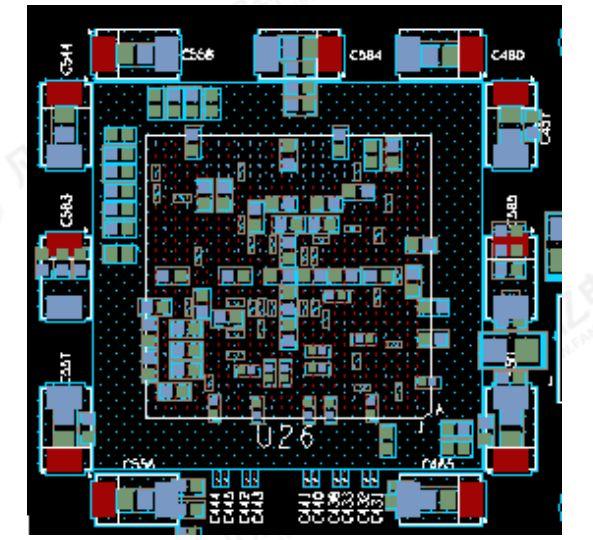 6)BGA器件的電源濾波電容背面布局,盡量靠近相應(yīng)的電源管腳布局,布局在BGA的兩相鄰焊盤的對(duì)稱中心上,(部分客戶要求:不要蓋住BGA的焊盤,避免作X射線檢測(cè)時(shí)照射不到BGA的焊盤)。如圖1-6所示。