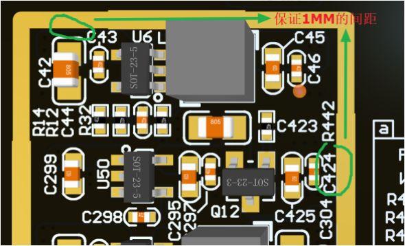 1)常規(guī)后焊器件(接插件),同層布局時(shí),器件保證和接插件1.5mm及以上間距,背面布局器件時(shí),保證至少3mm及以上間距要求。插拔器件或板邊連接器周圍3mm范圍內(nèi)盡量不布置SMD器件,以防止連接器插拔時(shí)產(chǎn)生的應(yīng)力損傷器件,如圖1-4所示。
