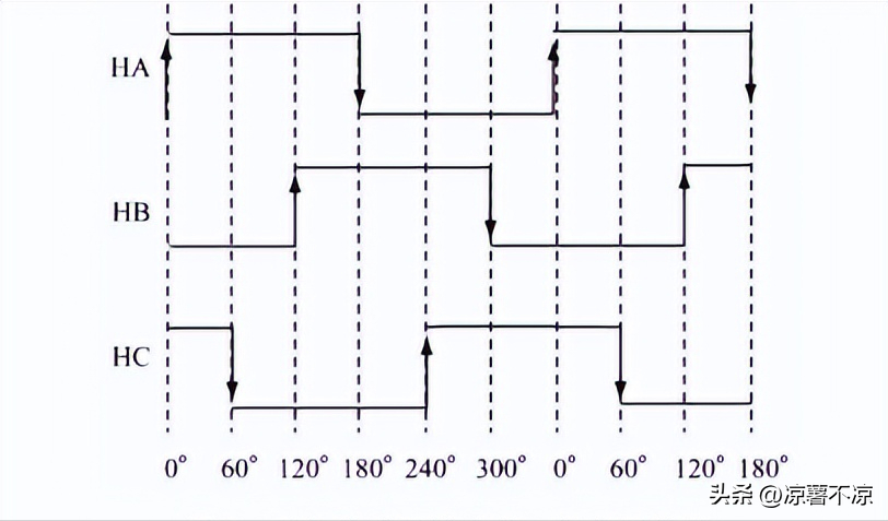三相霍爾元件輸出的位置信號(hào),每隔60度電角,便有一個(gè)位置信號(hào)發(fā)生跳變,這樣在一個(gè)周期內(nèi)有6個(gè)轉(zhuǎn)子位置可以被確定。