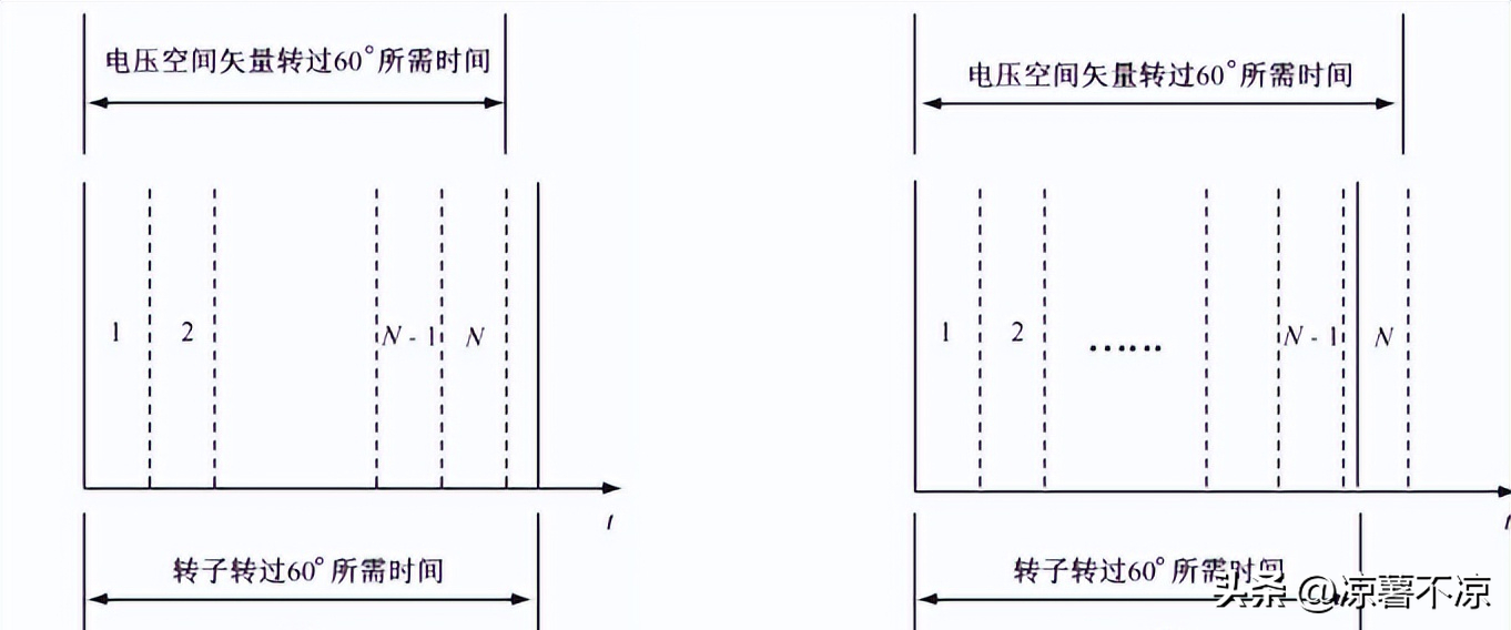 每個(gè)小區(qū)間通過(guò)相鄰兩基本關(guān)量和零矢量的組合來(lái)合成該區(qū)間的電壓空間矢量,這樣一個(gè)周期將有6N個(gè)電壓空間矢量每隔60/N電角切換一次。