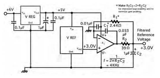 如您所見,由R 2和C 2創(chuàng)建的單極點(diǎn)低通濾波器位于精密放大器的輸出端。這樣,我們就可以避免電壓基準(zhǔn)IC驅(qū)動(dòng)大的容性負(fù)載。雖然低通濾波器將抑制來自基準(zhǔn)和運(yùn)算放大器的噪聲,但我們?nèi)匀恍枰\(yùn)算放大器具有非常低的噪聲、低偏移和低漂移。電阻應(yīng)采用低TC精密型,電容應(yīng)采用優(yōu)質(zhì)聚丙烯電容。