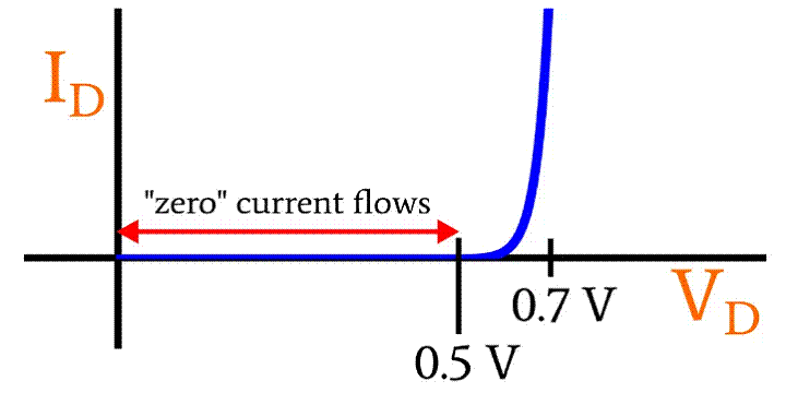 個閾值 0.5V 確定從可忽略電流到不可忽略電流的轉(zhuǎn)變。因此,當我們討論實際電路而不是的科學(xué)細節(jié)時,我們可以說,典型的硅二極管在正向電壓超過 0.5 V 之前不允許電流流動。