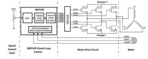 圖 2:三相 BLDC 電機(jī)的典型閉環(huán)控制系統(tǒng)包括控制器、驅(qū)動器和功率晶體管半橋 H。(圖片:德州儀器)