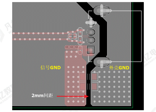 4、若USB兩邊定位柱接的是保護地,分割時保證與GND的距離是2MM,并在保護地區(qū)域多打孔,保證充分連接,如圖2所示。