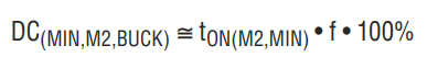 式中的 DC(MAX,M2,BUCK) 是 M2 開關(guān)在降壓區(qū)中的最大占空比百分?jǐn)?shù),其由下式給出: