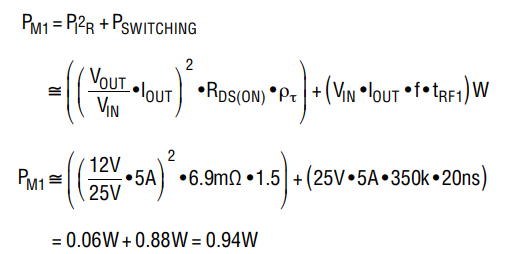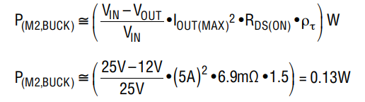 可通過選擇一個(gè)較低的開關(guān)頻率來降低 0.88W 的最大開關(guān)功耗。由于該計(jì)算是近似的,因此應(yīng)在 PCB 上測量實(shí)際的上升和下降時(shí)間以獲得更好的功耗估計(jì)。當(dāng)電路工作于降壓區(qū)時(shí),M2 中的最大功率耗散出現(xiàn)在最大輸入電壓下。若采用 6.9mΩ  FDMS7672,則功率耗散為:
