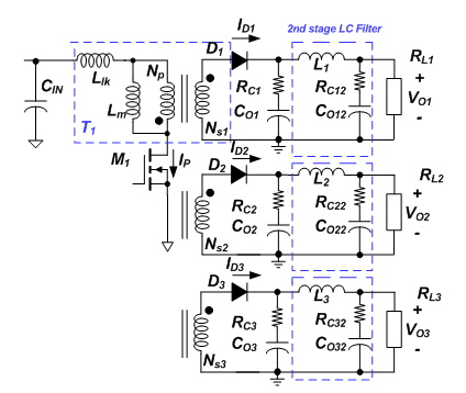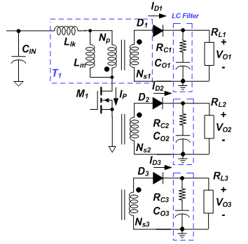 反激拓撲是離線充電器應用中流行的拓撲,因為它能夠處理寬輸入電壓范圍。通過在主變壓器上使用額外的繞組可以輕松產(chǎn)生多個輸出。圖 1 展示了具有多個輸出的反激式轉(zhuǎn)換器。
