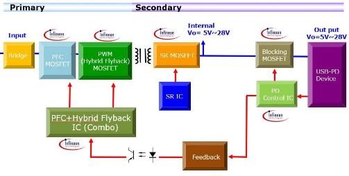 圖示3-大聯(lián)大品佳基于Infineon產(chǎn)品的140W電源適配器方案的方塊圖
