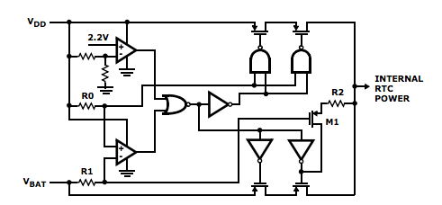 所有具有電池切換功能的 Intersil RTC(例如 ISL12026 系列)均具有內(nèi)部保護(hù)電路,以防止反向充電。圖 1 顯示了內(nèi)部切換電路,說(shuō)明了互補(bǔ)控制,該控制禁用一個(gè)電源輸入,同時(shí)啟用另一個(gè)電源輸入。兩個(gè)系列 MOSFET 開(kāi)關(guān)提供安全開(kāi)關(guān)和冗余。它也是從 VDD 到 VBAT 的路徑,通過(guò)用于上拉 VBAT 開(kāi)關(guān)柵極的 MOSFET (M1) 和兩個(gè) 200Ω 電阻器(R1 和 R2)。如果 M1 柵極短路,流過(guò)電阻器 R1 和 R2 的電流將限制鋰電池的充電電流(當(dāng) VDD = 5.5V、VBAT = 1.8V 時(shí),充電電流高達(dá) 9.25mA)。