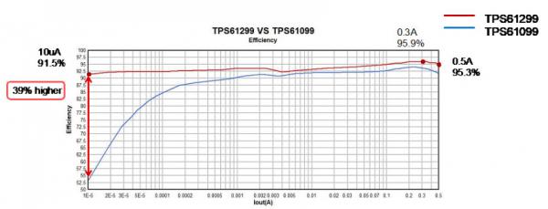 圖 5:TPS61299 和 600nA IQ 器件的效率曲線
