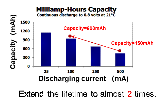 電池容量與放電電流成反比,電池使用壽命與容量具有線性關(guān)系,如圖 6 所示。將放電電流從 500mA 降至 100mA 可將電池使用壽命增加一倍。