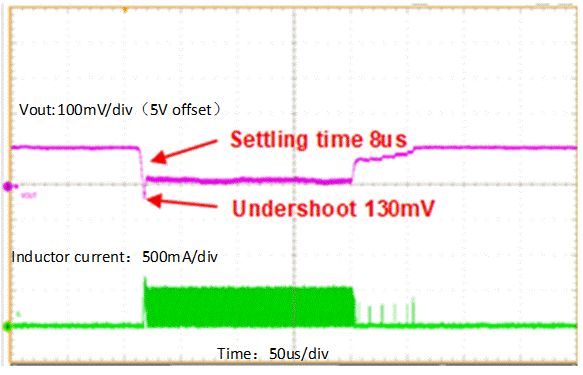 然而,TPS61299 可實現(xiàn)更快的瞬態(tài)響應(yīng)時間,且?guī)捀鼘。例如,?nbsp;3.6V 輸入和 5V 輸出條件下,輸出電流從 0mA 升高至 200mA 的典型穩(wěn)定時間是 8µs,如圖 9 所示。