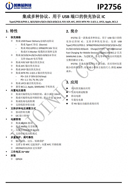 英集芯 IP2756 是一款集成多種協(xié)議,用于 USB 端口的快充協(xié)議控制 IC,支持多種快充協(xié)議,包括 PD2.0/PD3.1 SPR&EPR36V、HVDCP、QC5/4+/3+/3.0/2.0、VFCP、UFCS、Apple 2.4A、BC1.2 以及 SAMSUNG 2.0A。為適配器、車(chē)充等單向輸出應(yīng)用提供完整的解決方案。