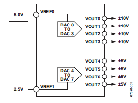 根據(jù)AD5362的描述,我們了解到器件內(nèi)部DAC0-DAC3使用一個基準源VREF0,DAC4-DAC7使用另外一個基準源VREF1,所以可以利用不同的基準電壓值來實現(xiàn)不同的DAC輸出范圍,如下圖(圖2)所示: